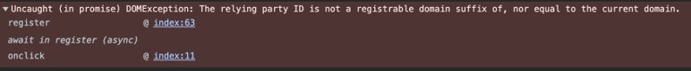 - 인증 과정에서 Relying Party ID (URL 기반)을 기반으로 private key에 대한 scope가 있어 피싱 사이트에서는 해당 private key를 인식하거나, 사용할 수 없다. 아래는 현재 호스트가 아닌 웹페이지로 API를 호출했을 때 발생하는 오류이다.