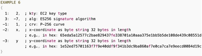 - Attested Credential Data (새로 생성된 Credential Data, 즉 public key)는 COSE 형식으로 되어 있다, 즉 CBOR 인코딩되어 있다.