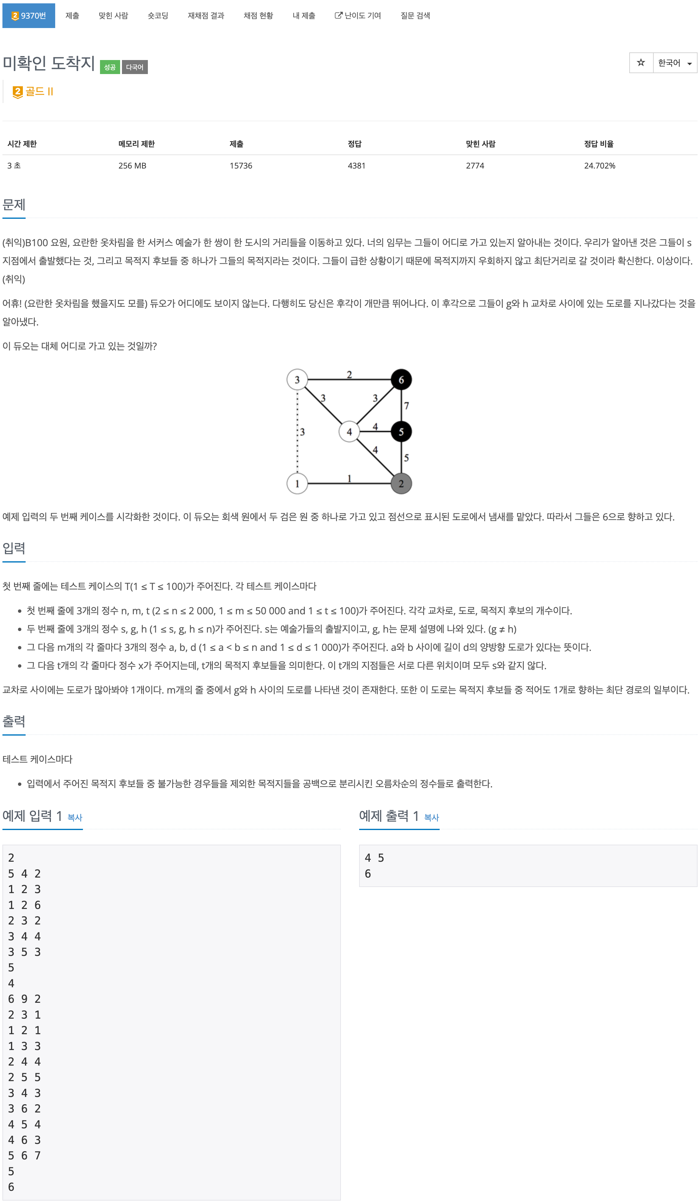 9370번: 미확인 도착지 (취익)B100 요원, 요란한 옷차림을 한 서커스 예술가 한 쌍이 한 도시의 거리들을 이동하고 있다. 너의 임무는 그들이 어디로 가고 있는지 알아내는 것이다. 우리가 알아낸 것은 그들이 s지점에서 www.acmicpc.net 백준 온라인 저지 9370번 미확인 도착지 문제입니다. 어떤 사람이 목적지까지 최단 경로로 간다는 가정으로 문제가 시작합니다. 이 사람이 출발한 지점과 통과한 경로, 그리고 가능한 목적지가 주어졌을 때, 어떤 목적지가 실제로 통과한 경로를 거쳐서 가는 것이 최단 경로인 것인지 계산하는 문제입니다. 풀이 코드입니다. import heapq import sys input = sys.stdin.readline T = int(input()) INF = 1e9 t..